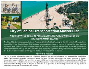 Join the City of Sanibel for the Transportation Master Plan Public Workshop, Thursday, March 26th from 6pm to 8pm at the Sanibel Community House!