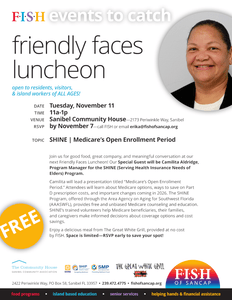 FISH OF SANCAP invites the community to its November Friendly Faces luncheon on Tuesday, November 11 at 11:00 a.m. at the Sanibel Community House. Guests will enjoy a meal provided by Great White Grill while learning valuable information about Medicare’s Open Enrollment period.