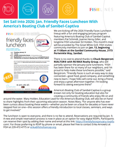 FISH OF SANCAP is kicking off its 2026 Friendly Faces Luncheon lineup with a fun and engaging January program featuring America’s Boating Club of Sanibel-Captiva members Pat Schmidt, Joanne Heroy Giller, and longtime FISH volunteer Ed Holden.