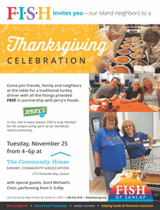 Come join FISH, friends, family and neighbors at the table for a traditional turkey dinner with all the fixings provided FREE in partnership with Jerry’s Foods, with special guests, Saint Michael’s Choir, performing from 5–5:40pm at the Sanibel Community House, 2173 Periwinkle Way, Sanibel.